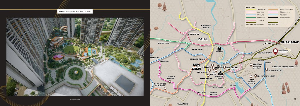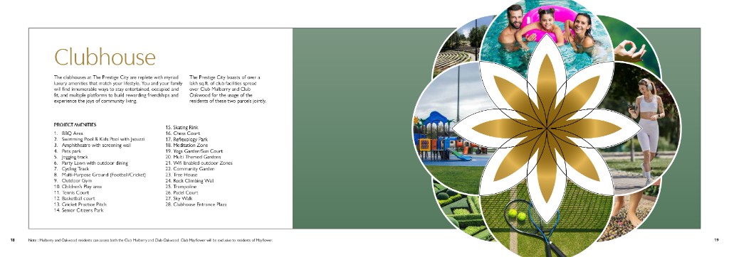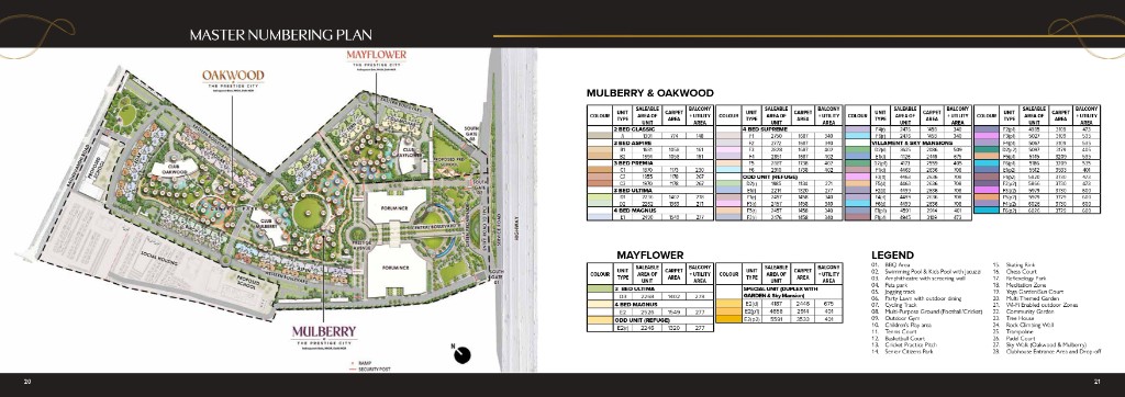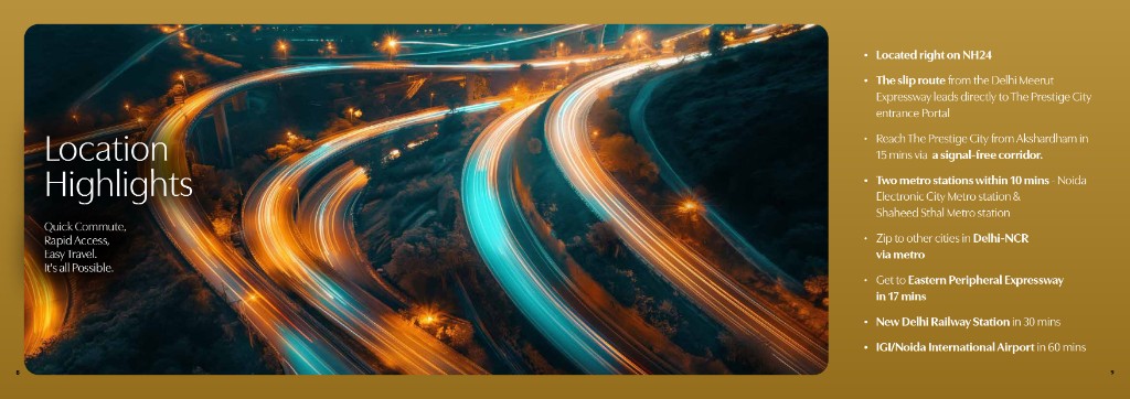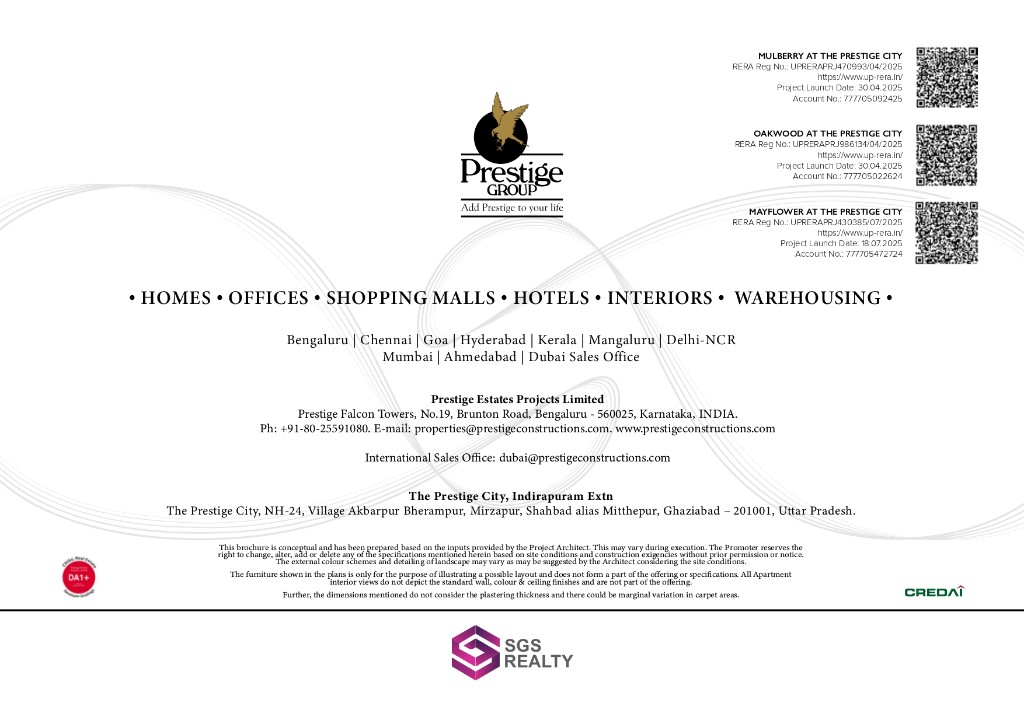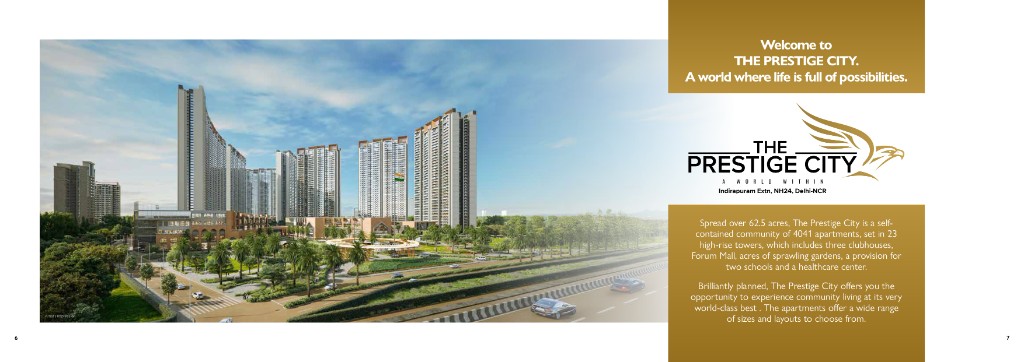The Prestige City at Indirapuram Extension is Prestige Group’s flagship mixed-use township on NH-24 — spread across 62.5 acres with 4,041 apartments across 23 high-rise towers, three clubhouses, Forum Mall within the community, acres of gardens, provision for two schools, and a healthcare centre. Residential parcels include Mulberry & Oakwood (2–4 BHK homes, villaments, and sky mansions) and Mayflower, with Club Mulberry and Club Oakwood shared by Mulberry & Oakwood residents and Club Mayflower exclusive to Mayflower. Connectivity: slip access from Delhi–Meerut Expressway, signal-free corridor towards Akshardham (~15 mins), Noida Electronic City & Shaheed Sthal metro within ~10 mins, Eastern Peripheral Expressway ~17 mins, New Delhi Railway Station ~30 mins, IGI / Jewar airports ~60 / ~75 mins. Site address: NH-24, Village Akbarpur Bherampur, Mirzapur, Shahbad alias Mitthepur, Ghaziabad – 201001, Uttar Pradesh. Developer: Prestige Estates Projects Limited.